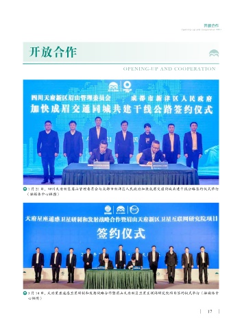 开放合作 Opening-up and Cooperation 开放合作 opening-up and Cooperation 1 月 21 日,四川天府新区眉山管理委员会与成都市新津区人民政府加快成眉交通同城共建干线公路签约仪式举行 (融媒体中心供图) 3 月 14 日,天府星座遥感卫星研制和发射战略合作暨眉山天府新区卫星互联网研究院项目签约仪式举行(融媒体中 心供图) 17