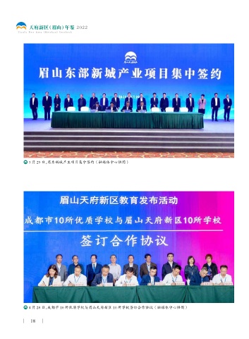 天府新区(眉山)年鉴 2022 Ti a n f u Ne w A r e a (M e i s h a n) Ye a r b o ok 3 月 29 日,眉东新城产业项目集中签约(融媒体中心供图) 4 月 28 日,成都市 10 所优质学校与眉山天府新区 10 所学校签订合作协议(融媒体中心供图) 18