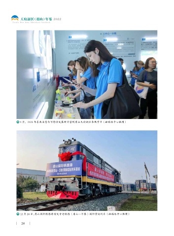 天府新区(眉山)年鉴 2022 Ti a n f u Ne w A r e a (M e i s h a n) Ye a r b o ok 9 月,2021 年东北亚青年可持续发展研习营到眉山天府新区参观学习(融媒体中心供图) 12 月 24 日,眉山国际铁路港首发中老铁路(眉山—万象)国际货运列车(融媒体中心供图) 20