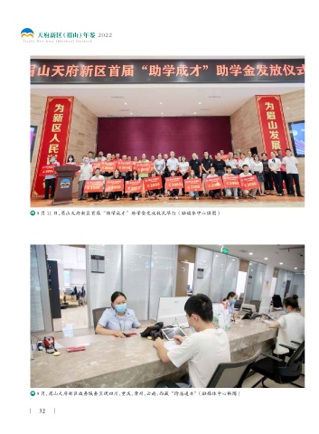 天府新区(眉山)年鉴 2022 Ti a n f u Ne w A r e a (M e i s h a n) Ye a r b o ok 9 月 11 日,眉山天府新区首届“助学成才”助学金发放仪式举行(融媒体中心供图) 9 月,眉山天府新区政务服务实现四川、重庆、贵州、云南、西藏“跨省通办”(融媒体中心供图) 32