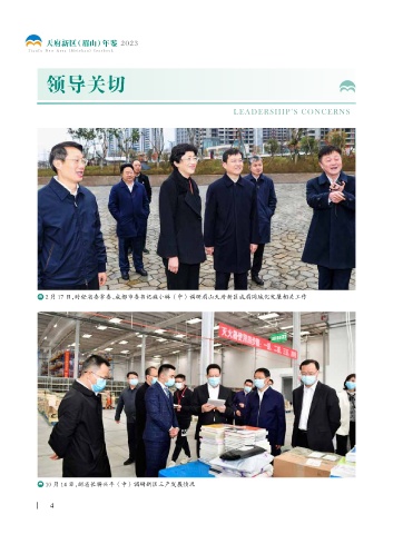 天府新区(眉山)年鉴 2023 Ti a n f u Ne w A r e a (M e i s h a n) Ye a r b o ok 领导关切 Leadership’s ConCerns 2 月 17 日,时任省委常委、成都市委书记施小琳(中)调研眉山天府新区成眉同城化发展相关工作 10 月 14 日,副省长杨兴平(中)调研新区三产发展情况 4