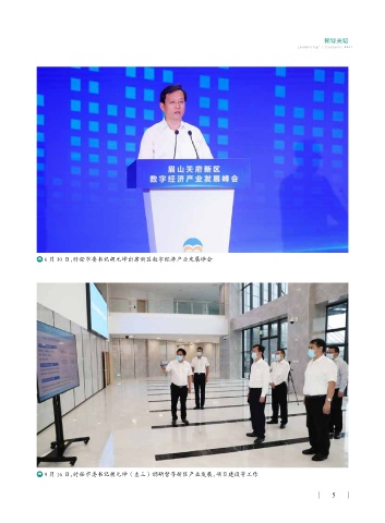 领导关切 Leadership’s Concerns 6 月 30 日,时任市委书记胡元坤出席新区数字经济产业发展峰会 9 月 16 日,时任市委书记胡元坤(左三)调研督导新区产业发展、项目建设等工作 5