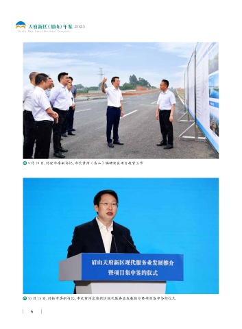 天府新区(眉山)年鉴 2023 Ti a n f u Ne w A r e a (M e i s h a n) Ye a r b o ok 9 月 19 日,时任市委副书记、市长黄河(右二)调研新区项目投资工作 10 月 13 日,时任市委副书记、市长黄河出席新区现代服务业发展推介暨项目集中签约仪式 6