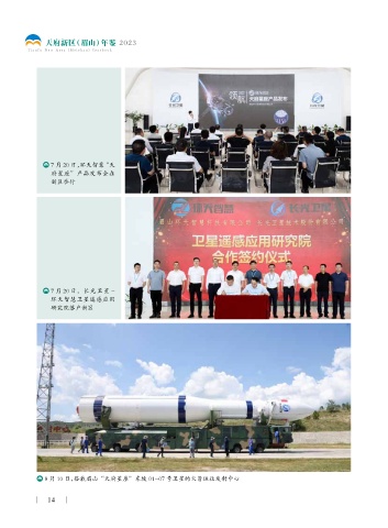 天府新区(眉山)年鉴 2023 Ti a n f u Ne w A r e a (M e i s h a n) Ye a r b o ok 7 月 20 日,环天智慧“天 府星座”产品发布会在 新区举行 7 月 20 日,长光卫星 - 环天智慧卫星遥感应用 研究院落户新区 8 月 10 日,搭载眉山“天府星座”东坡 01-07 号卫星的火箭运往发射中心 14