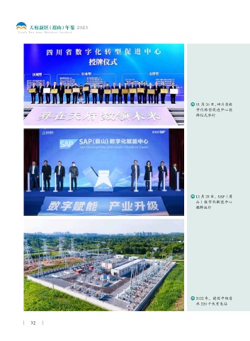 天府新区(眉山)年鉴 2023 Ti a n f u Ne w A r e a (M e i s h a n) Ye a r b o ok 11 月 26 日,四川省数 字化转型促进中心授 牌仪式举行 12 月 28 日,SAP(眉 山)数字化赋能中心 揭牌运行 2022 年,建设中的清 水 220 千伏变电站 32