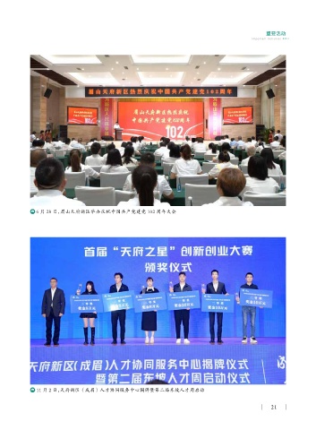 重要活动 Important Activities 6 月 28 日,眉山天府新区举办庆祝中国共产党建党 102 周年大会 11 月 2 日,天府新区(成眉)人才协同服务中心揭牌暨第二届东坡人才周启动 21