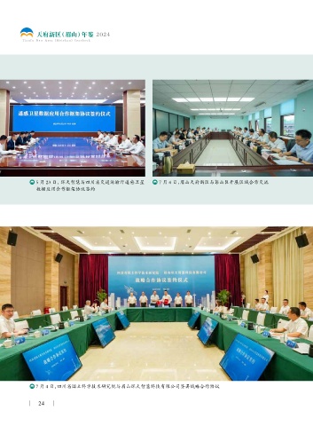 天府新区(眉山)年鉴 2024 Ti a n f u Ne w A r e a (M e i s h a n) Ye a r b o ok 5 月 23 日,环天智慧与四川省交通运输厅遥感卫星 7 月 4 日,眉山天府新区与彭山区开展区域合作交流 数据应用合作框架协议签约 7 月 4 日,四川省国土科学技术研究院与眉山环天智慧科技有限公司签署战略合作协议 24