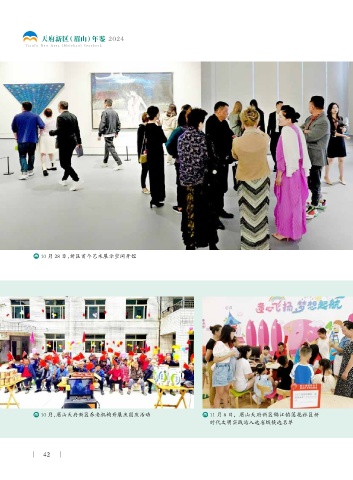 天府新区(眉山)年鉴 2024 Ti a n f u Ne w A r e a (M e i s h a n) Ye a r b o ok 10 月 28 日,新区首个艺术展示空间开馆 10 月,眉山天府新区养老机构开展庆国庆活动 11 月 8 日,眉山天府新区锦江镇莲花社区新 时代文明实践站入选省级 候选名单 42