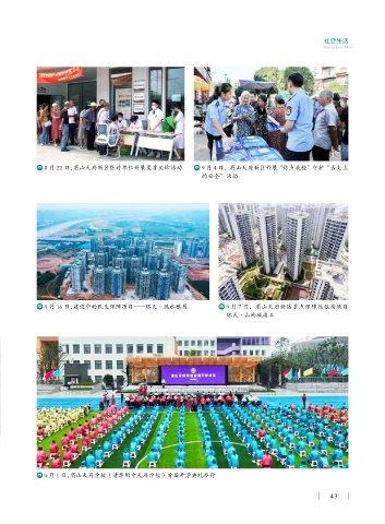 社会生活 Social Life 8 月 22 日,眉山天府新区医疗单位开展夏季义诊活动 9 月 4 日,眉山天府新区开展 “你点我检” 守护“舌尖上 的安全”活动 9 月 16 日,建设中的民生保障项目——环天 · 悦水雅居 9 月 7 日,眉山天府新区重点保障性住房项目 环天 · 山屿城竣工 9 月 1 日,眉山天府学校(清华附中天府学校)首届开学典礼举行 43