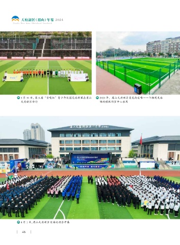 天府新区(眉山)年鉴 2024 Ti a n f u Ne w A r e a (M e i s h a n) Ye a r b o ok 3 月 30 日,第三届“贡嘎杯”青少年校园足球联赛在眉山 2023 年,眉山天府新区青龙街道唯一一个拥有足球 天府新区举行 场的镇级邻里中心启用 4 月 1 日,眉山天府新区首届运动会开幕 46