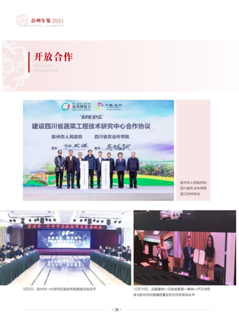 彭州年鉴 2021 P E N G Z H O U Y E A R B O OK 开放合作 开放合作 PENGZHOU YEARBOOK 彭州市人民政府和 四川省农业科学院 签订合作协议 3月2日,彭州市—什邡市区域协同发展座谈会召开 12月14日,法国塞纳—马恩省莫雷—塞纳—卢万共同 体与彭州市白鹿镇签署友好合作关系协议书 ·20·