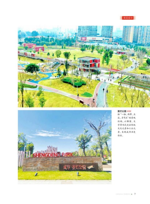 美丽成华 圣灯公园 <<< 按“一轴、两带、五 区,多节点”的景观 结构,以雕塑、文 字等形式突出传统 文化元素和工业元 素,呈现成华历史 传承。 CHENGHUA YEARBOOK 7