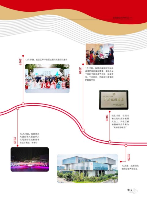 武侯建区30年印记>>> 12月21日,武侯区举行首届三国文化国际汉服节 2019 1月25日,按照武侯区新冠肺炎 疫情防控指挥部要求,全区机关 干部职工取消春节休假,返岗工 2020 作,下沉社区,协助做好疫情联 防联控工作 9月25日,在四川 省文化和旅游发展 大会上,武侯区被 2020 省委省政府命名为 “天府旅游名县” 10月20日,成都音乐 大道启幕式暨音乐文 化周活动在成都城市 音乐厅黑胶广场举行 2019 2020 12月底,成都京东 西南总部大楼竣工 017